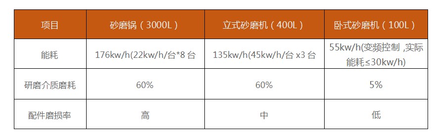 第四招:能耗 因卧式砂磨机高效的研磨方式,使研磨时间大大缩短,一台砂磨机的产量相当于八台砂磨锅的产量。同时,卧式砂磨机配有柔性启动装置和变频控制系统,在设备瞬间启动时的电流和设备运行过程中的工作电流很小,能耗远远低于砂磨锅。 |