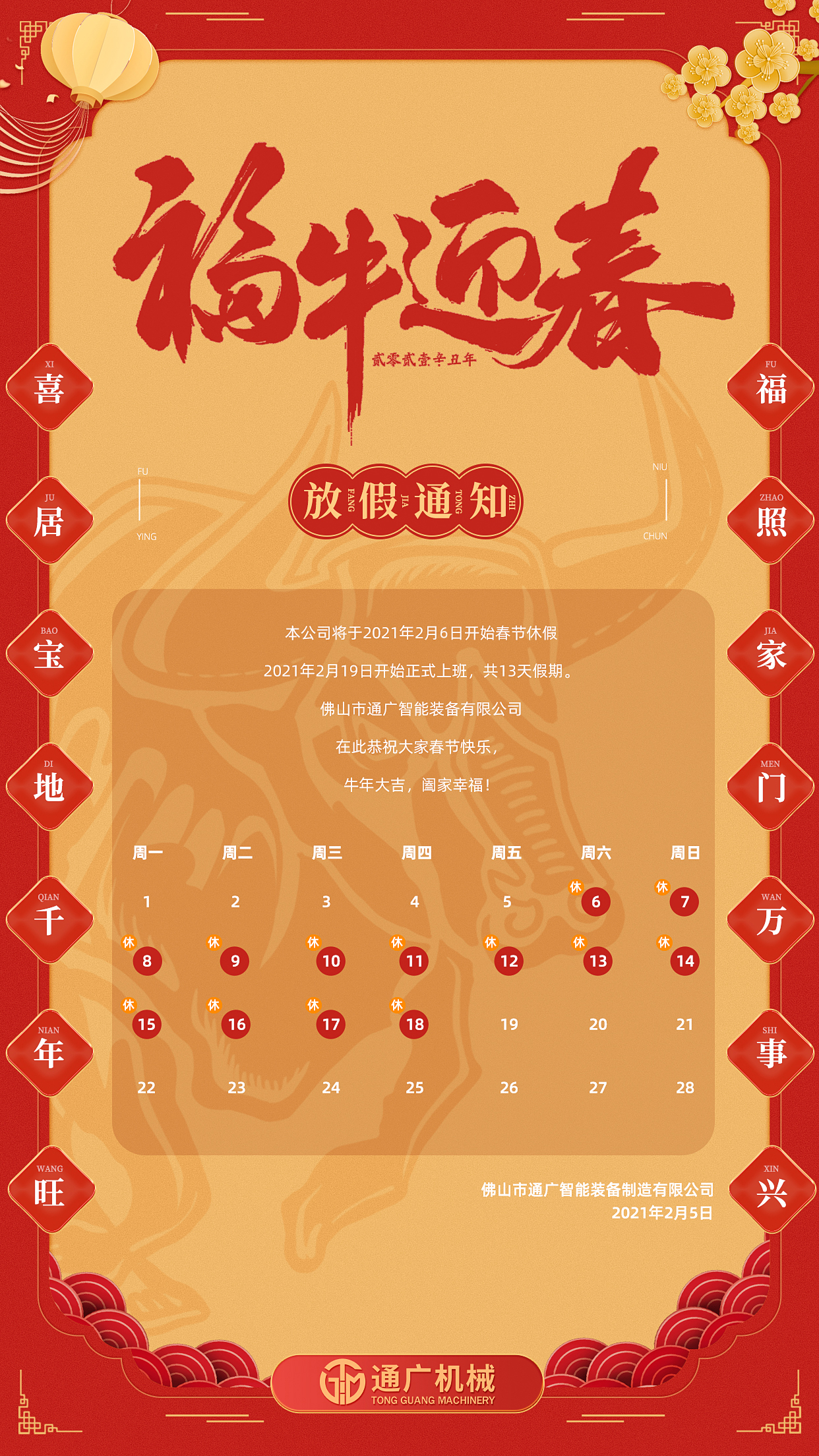 通广智能装备有限公司春节放假通知